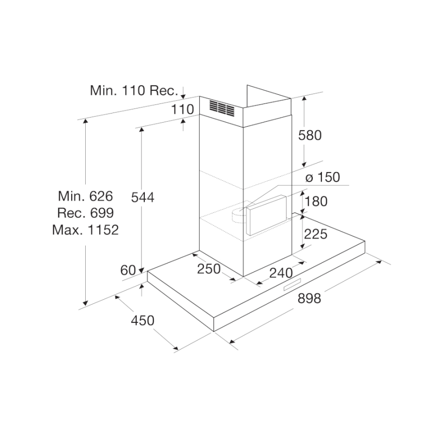 De Pelgrim BSK963MAT Afzuigkap is een Schouwkap, 90 cm breed, matzwart, capaciteit 260 - 600 m³,/h, geschikt voor afvoer naar buiten en recirculatie (1 x koolstoffilter HF2012 bijbestellen), geschikt voor PlasmaMade filter, 4 snelheden, 3 x aluminium vetfiltercassettes, 2x 2,5 W LED spots, energieklasse A, bediening door elektronische druktoetsen, intensiefstand