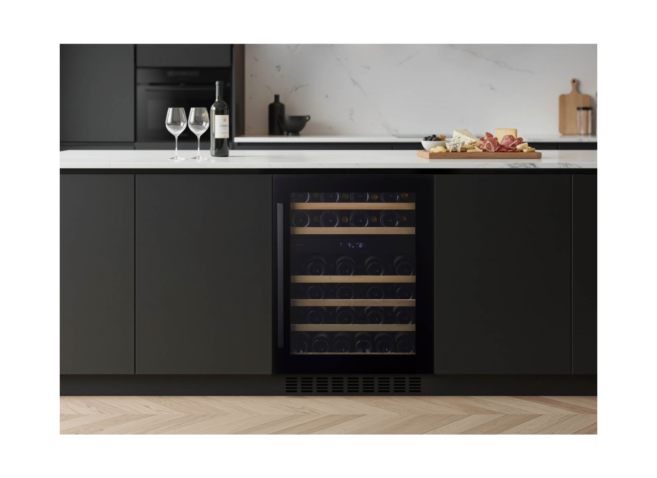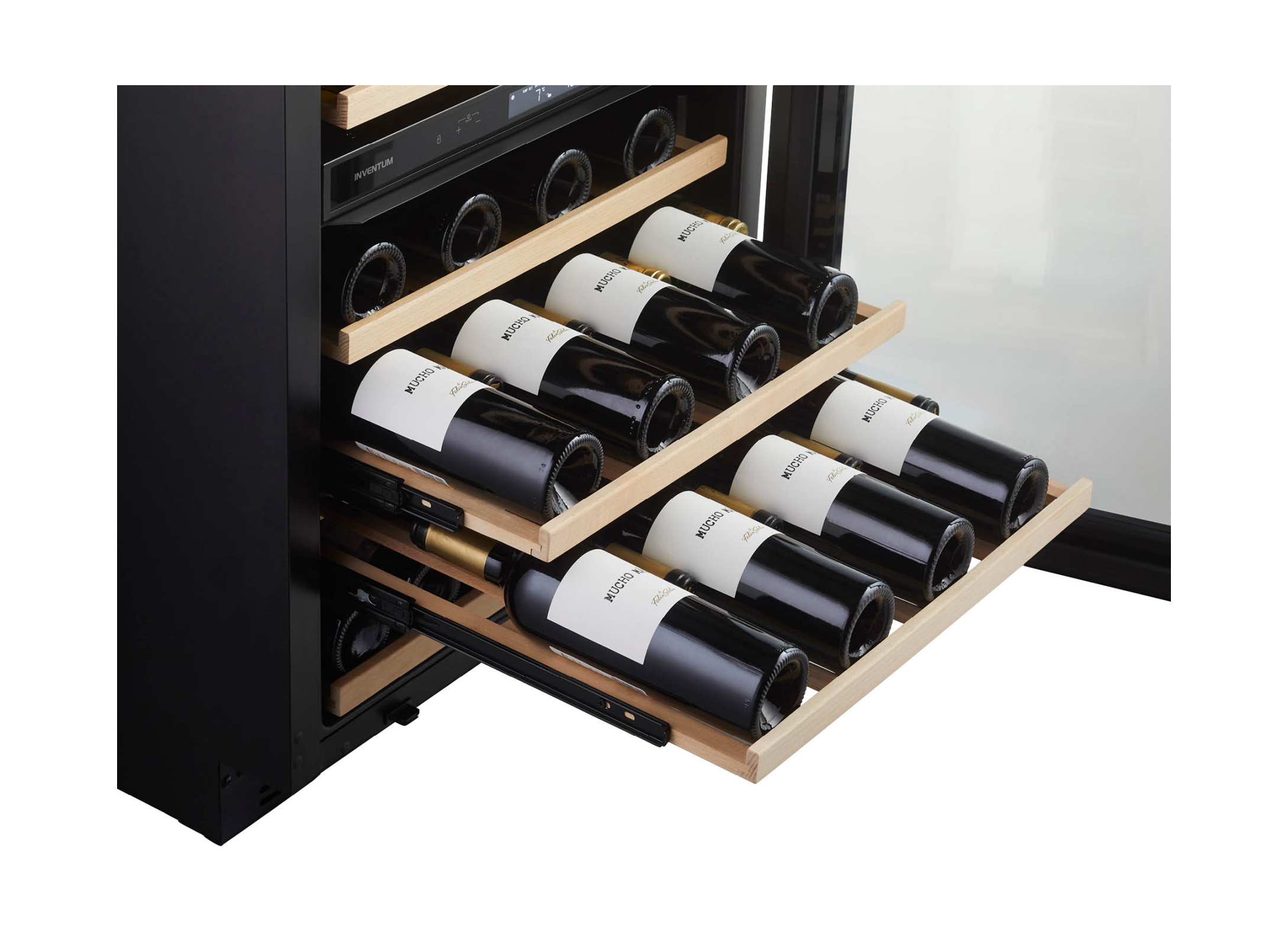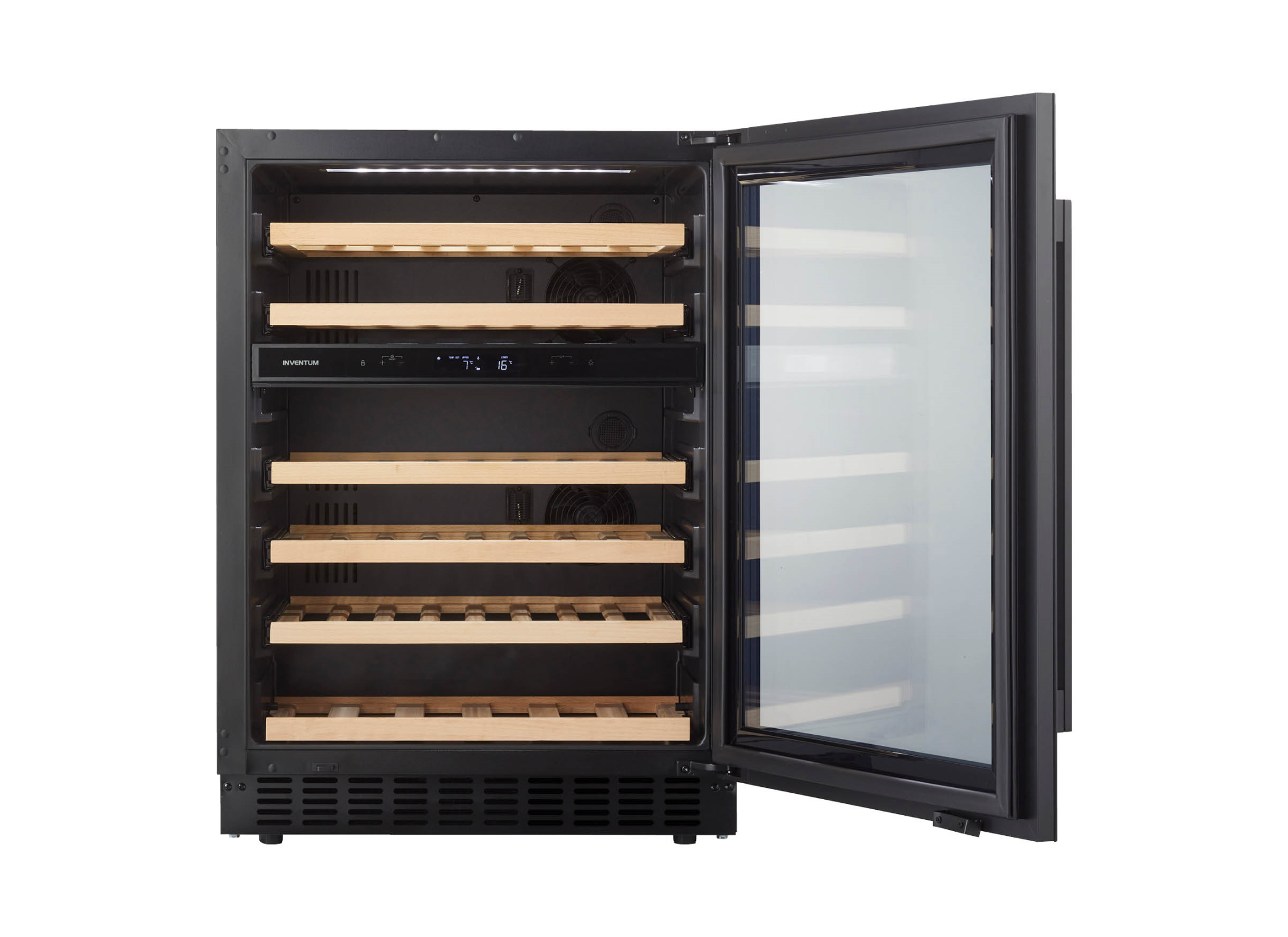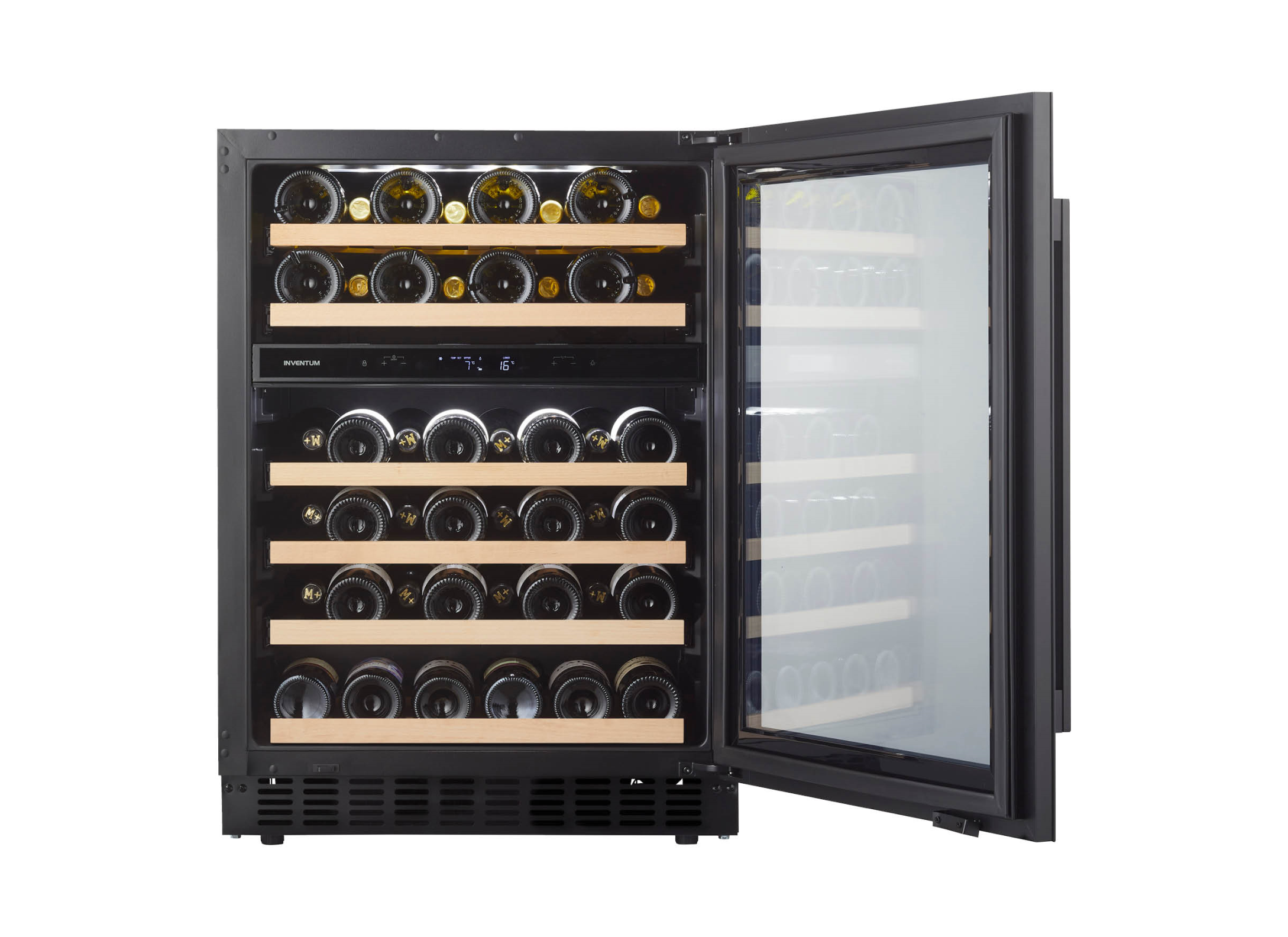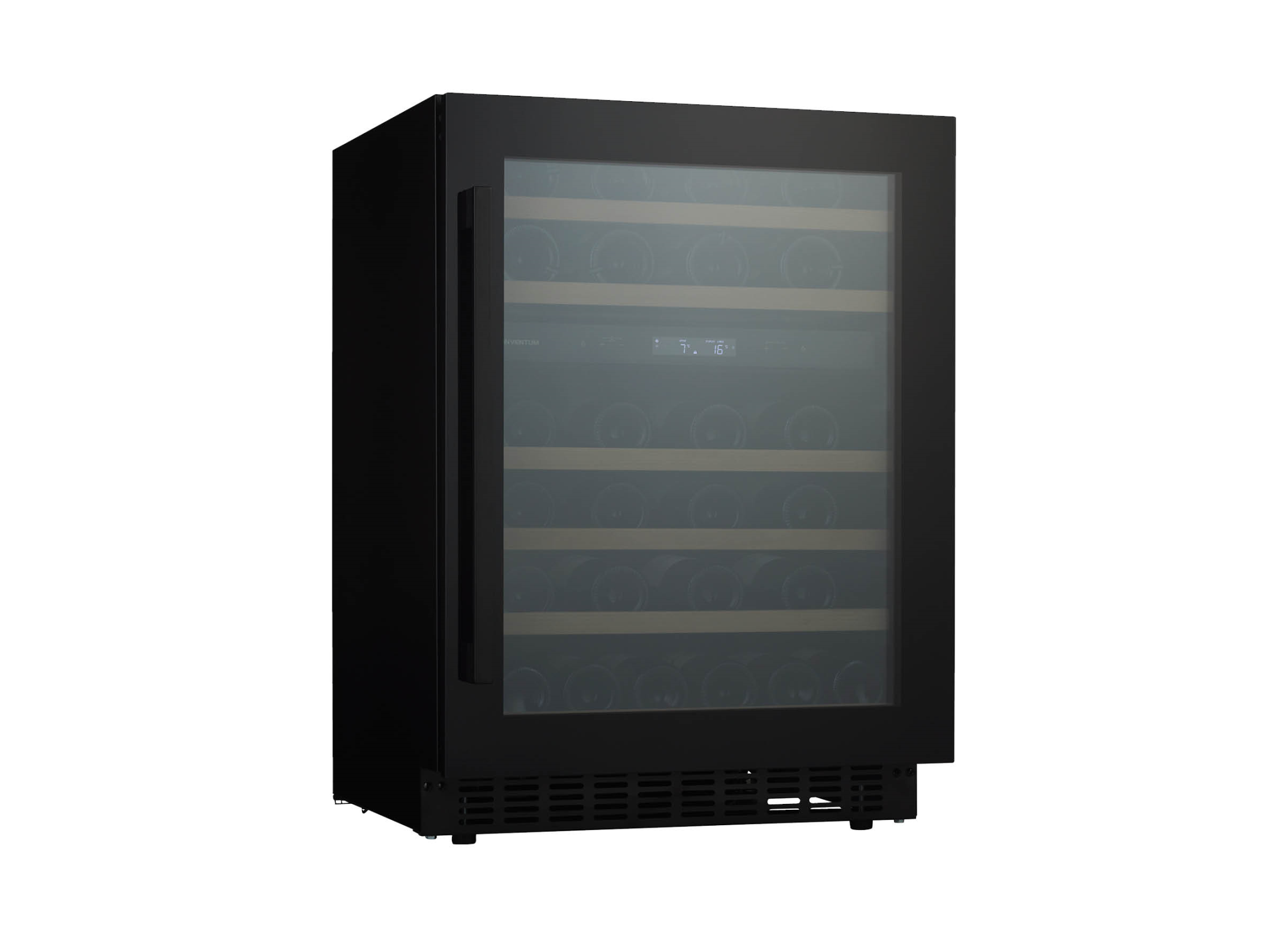 De Inventum IKW0822D wijnklimaatkast (onderbouw) bewaart wijn stijlvol met ruimte voor 46 flessen, zes beukenhouten schappen op telescopische rails en ledverlichting en een zwarte glazen deur. Zo serveer je flessen op de juiste temperatuur en geef je de keuken direct een luxe uitstraling.