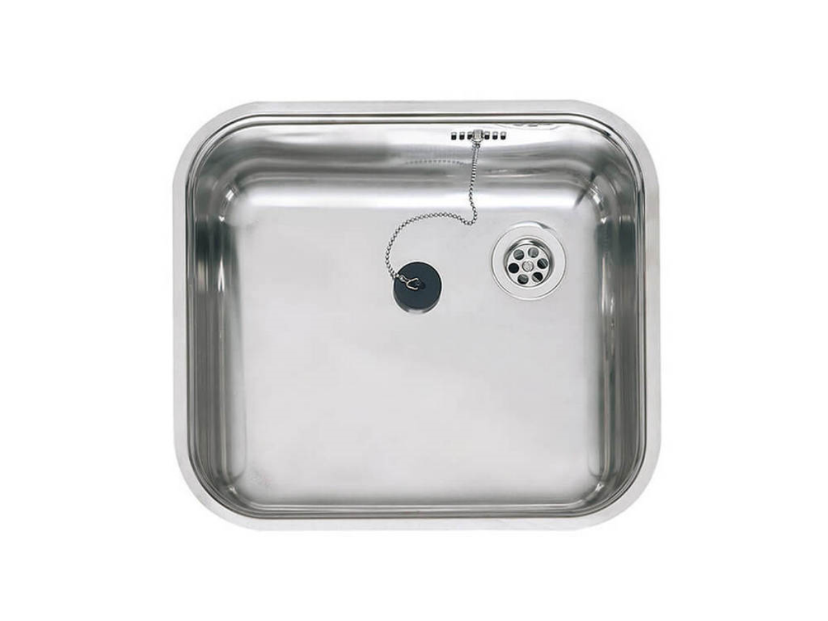 Enkele bak, roestvrijstaal, voorzien van plug met stop en ketting. Accessoires worden niet meegeleverd